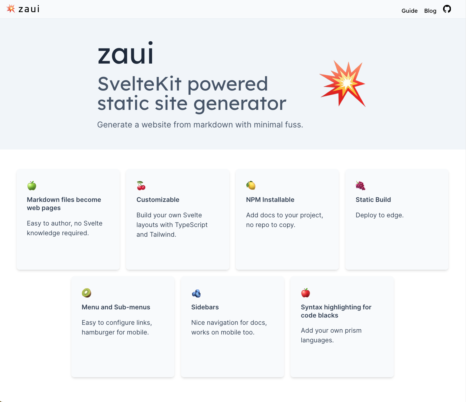 The landing page design was inspired by VitePress -- thank you Evan -- with a Hero section at the top and Feature boxes below that.